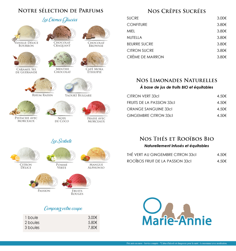 Pour les crèmes glacées, la sélection compte plus de 60 parfums utilisant du beurre, de la crème, du lait local sans huiles végétales ajoutées, avec des goûts comme Amande, Café Moka, Caramel fleur de sel de Camargue, Pistache, Noisette, Nougat de Montélimar, Vanille Délice, et des créations raffinées.